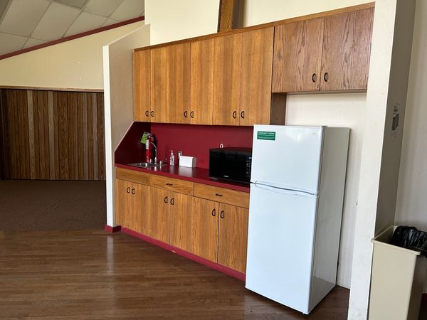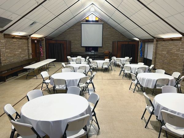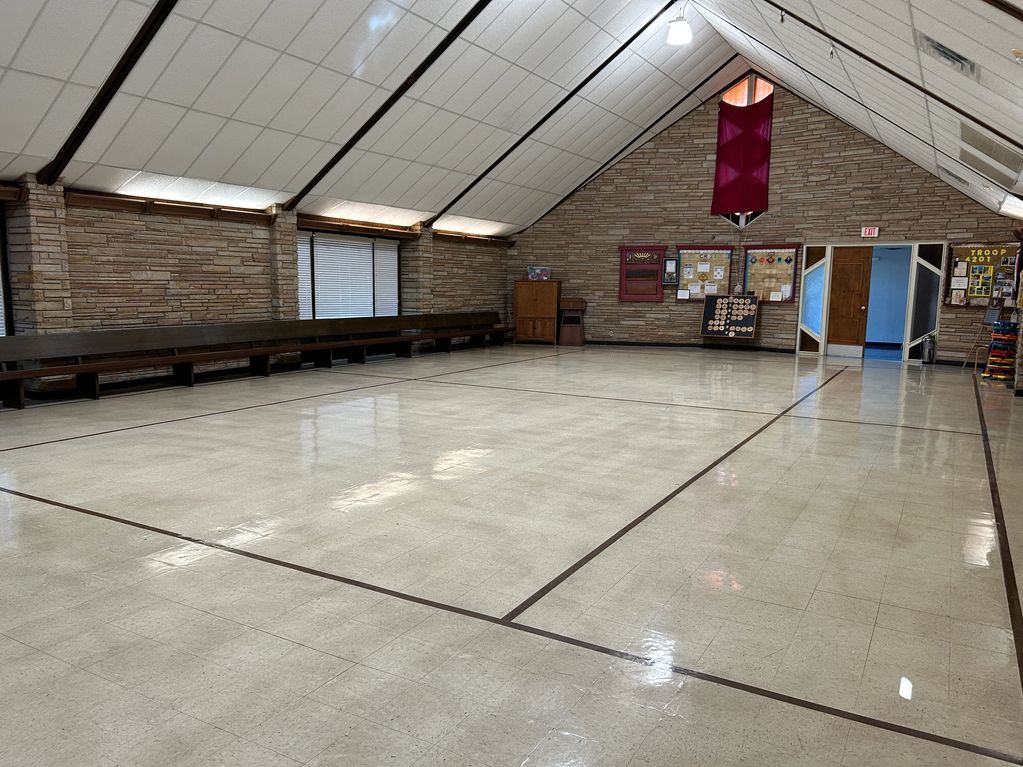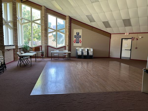 The sanctuary is a large space with many pews. The front of the room is open and great for orchestra or other musical or performance set up. There is a projector screen and sound system available. Occupancy 346.